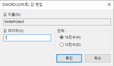 ์ด๋ฆ์ WriteProtect๋ก ์ค์ ํ ๊ฐ ๋ฐ์ดํฐ๋ฅผ 1๋ก ์ง์ ํด์ค๋ค.๊ฐ์ด 1์ผ ๊ฒฝ์ฐ ์ฐ๊ธฐ๋ฐฉ์ง ์ค์