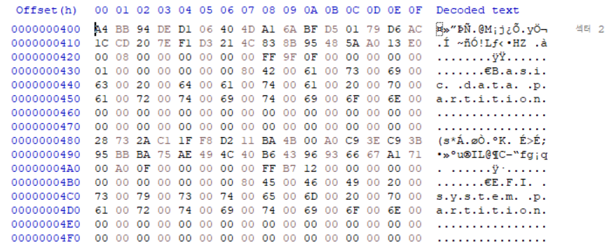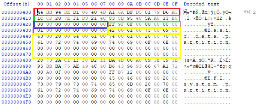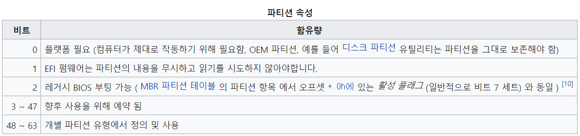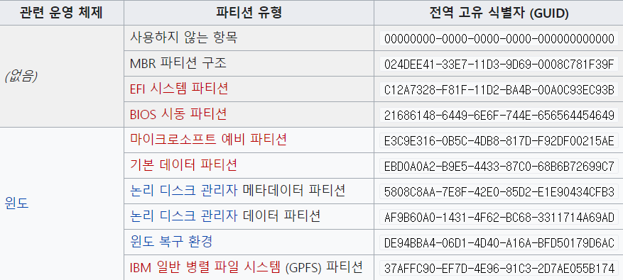 - Partition Type GUID(16 byte) : ํํฐ์ ์ ์ข ๋ฅ๋ณ ํ ๋น๋ GUID์ํค๋ฐฑ๊ณผ